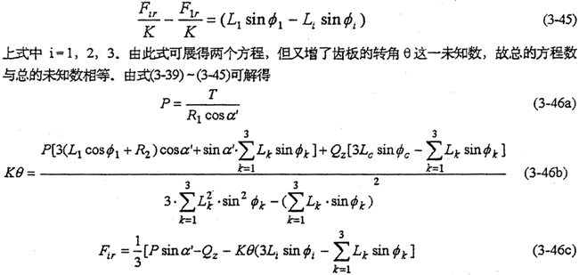 該機構的靜不定次數(shù)S=1,故需增加一個補充方程,才能完全確定機構的各動力參數(shù)。由齒板位移協(xié)調(diào)方程式(3-14)得