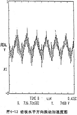 圖6-12是齒板的實(shí)測(cè)振動(dòng)加速度時(shí)域曲線圖。從時(shí)域曲線圖可知,SHQ40型齒板的振動(dòng)加速度中,存在穩(wěn)態(tài)正弦分量,它是由于齒板作圓周平動(dòng)運(yùn)動(dòng)產(chǎn)生。在其上迭加的每轉(zhuǎn)兩次沖擊及其振動(dòng)響應(yīng)衰減信號(hào),明顯表現(xiàn)出齒板的加速度沖擊信號(hào),而且最大沖擊發(fā)生在齒板過(guò)死點(diǎn)位置,每轉(zhuǎn)兩次非等幅沖擊,恰好構(gòu)成轉(zhuǎn)頻16.667Hz的周期函數(shù)。