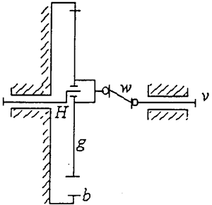 由公式(2-1)可知,在徑向尺寸受到一定的限制時,要獲得較大的傳動比,必須減少中心輪Za的齒數(shù)。但Za受到最小根切齒數(shù)的限制,不能太小。因此,為了獨得較大的傳動比,人們把行星輪加大,甚至完全去掉中心輪,于是演變出行星齒輪傳動的另一種形式:K-H-V行星齒輪傳動,其結(jié)構(gòu)圖見2-2所示。它的基本構(gòu)件中心輪b、轉(zhuǎn)臂H和構(gòu)件V,當(dāng)中心輪固定,轉(zhuǎn)臂為主動,構(gòu)件V從動時,傳動比為:
