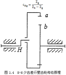 平行軸擺線針輪的基本原理是K-H少齒差行星齒輪傳動原理,見圖2.4,它應(yīng)用2.1中結(jié)構(gòu)形式,將平行雙曲柄四桿機構(gòu)的曲柄,α是連桿內(nèi)齒輪,b是定軸輸出外齒輪。其傳動比為: