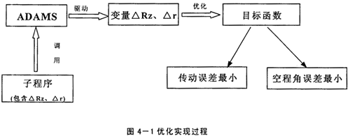 上已述及,擺線輪修形方式及修形量的選擇對(duì)RV減速器傳動(dòng)誤差及空程角誤差的影響很大,因此進(jìn)行優(yōu)化分析應(yīng)將傳動(dòng)誤差及空程角誤差作為目標(biāo)函數(shù),而將移距修形量△Rz及等距修形量△r作為設(shè)計(jì)變量,且△Rz與△r的正、負(fù)號(hào)表明了修形方式,子程序又是建立擺線輪的通用齒廓方程,通過ADAMS對(duì)子程序的調(diào)用,就可得到最優(yōu)的修形組合。具體的實(shí)現(xiàn)過程如下圖所示: