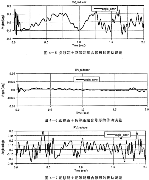 其中,θer——角度運(yùn)動(dòng)誤差,θin——任意時(shí)刻輸入軸轉(zhuǎn)角,i——傳動(dòng)比,θout——輸出軸轉(zhuǎn)角。由于加工誤差、輪齒修形的原因引起瞬時(shí)傳動(dòng)比的變化,必然出現(xiàn)傳動(dòng)誤差,產(chǎn)生運(yùn)動(dòng)的不平穩(wěn)性。在RV減速器中,漸開線齒輪嚙合在前級(jí),后級(jí)是擺線針輪傳動(dòng),由于后級(jí)的傳動(dòng)比一般約是前級(jí)的4~30倍,前級(jí)的漸開線齒輪的傳動(dòng)誤差將被縮小同樣的倍數(shù)后輸出,所以其傳動(dòng)誤差關(guān)鍵取決于后級(jí)的擺線針輪的嚙合誤差,而實(shí)際工作中擺線輪的修形方式及修形量的選擇是影響擺線針輪的嚙合誤差很大的因素。因此本課題中僅研究了輪齒修形對(duì)傳動(dòng)誤差的影響,所采用的修形量以及得到的傳動(dòng)誤差大小如表4-1所示,限于篇幅,對(duì)于負(fù)移距+正等距、正移距+負(fù)等距和正移距+正等距組合修形的傳動(dòng)誤差仿真結(jié)果曲線各只列出一組(圖4-5、4-6、4-7)。