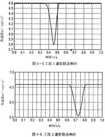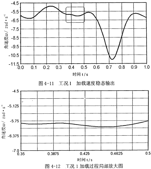 圖中慮線表示空載情況下ω的穩(wěn)態(tài)響應(yīng),可見(jiàn)很快達(dá)到穩(wěn)定,速度濾動(dòng)很小,實(shí)線表示加載過(guò)程ω的穩(wěn)態(tài)響應(yīng)。顯然,在加載時(shí)段,當(dāng)載荷驟增時(shí),會(huì)導(dǎo)致速度大幅降低。
