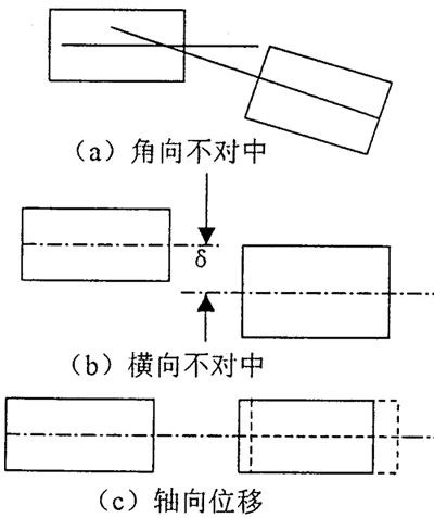 b.橫向不對中情況下,中心線平行但不重合,兩中心線間存在δ距離,最大橫向不對中極限值取決于聯(lián)軸器直徑和兩軸端的距離。