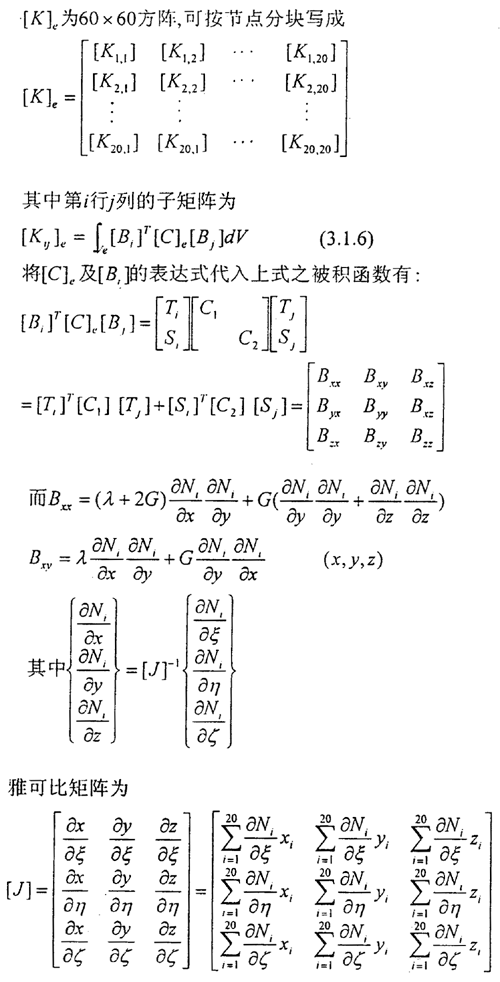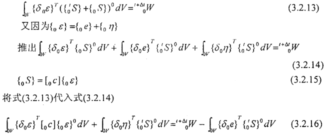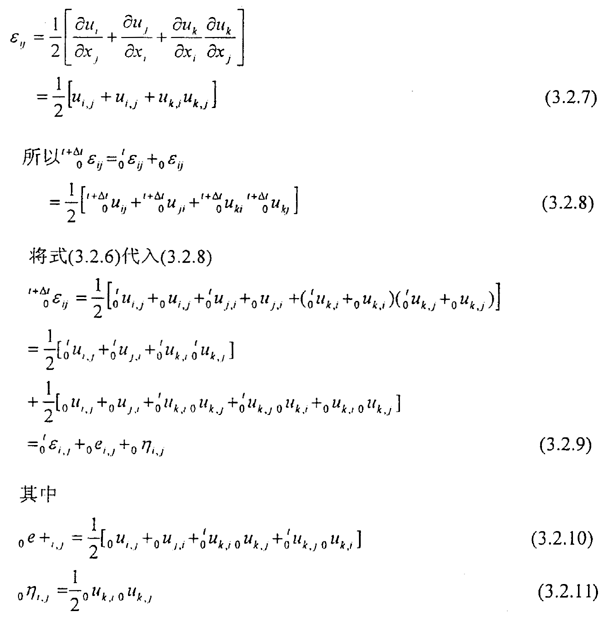 上式是將t+△t時刻的應力、應變、位移看成t時刻已知的應力、應變、位移和未知增量應力{0S},應變{0ε},位移{0u}之和,進一步,增量應變{0ε}可用線性部分即{oε}={oe}+{oη}