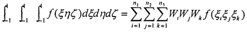 單元剛度陣中dV=∣J∣dξdηdζ,所以在局部坐標系ξηζ內(nèi)積分式(3.1.6),可采用三維高斯求積公式: