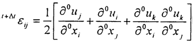 以t=0時刻為基準描述物體在t+△t時刻的平衡,在平衡方程中采用格林—拉格朗日應變分量 以及克;舴驈埩縯+ΔtSij,