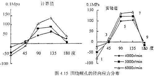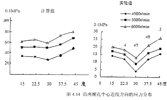 以上兩圖所示的實(shí)驗(yàn)數(shù)據(jù)與計(jì)算數(shù)據(jù)之間有一定的偏差,這是由于從計(jì)算模型上取的點(diǎn)與實(shí)驗(yàn)點(diǎn)并不能完全重合,因而產(chǎn)生一定的誤差,排除這些因素,我們可以看出,隨轉(zhuǎn)速的增大離心力相應(yīng)增大,沿螺孔圓周方向應(yīng)力中最大應(yīng)力出現(xiàn)在靠近X軸的孔邊附近,在兩螺孔連線上靠近螺孔處的應(yīng)力大,中間小,這些表明離心載荷下計(jì)算結(jié)果與實(shí)驗(yàn)結(jié)果的規(guī)律符合較好。