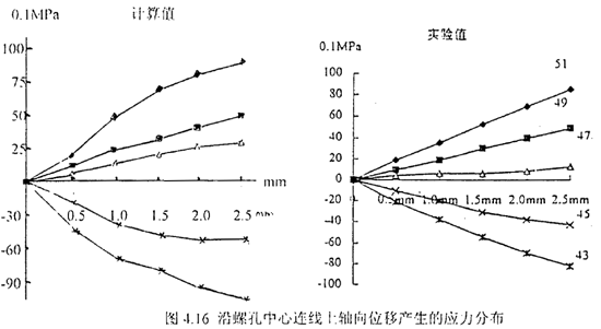 當(dāng)我們給定計(jì)算模型中三維體元上各點(diǎn)一個(gè)相同位移δ時(shí),所得到的兩螺孔中心連線上點(diǎn)的應(yīng)力分布圖如上所示,由圖可知,計(jì)算值與實(shí)驗(yàn)值符合較好。