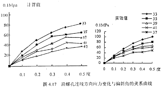角向位移與軸向位移之力學(xué)模型的區(qū)別是角向位移時(shí)螺孔處各點(diǎn)的位移量是不相等的,也屬于幾何非線性問(wèn)題,由圖可知,計(jì)算值與實(shí)驗(yàn)值是符合的,隨角向位移的增大應(yīng)力非線性增大。