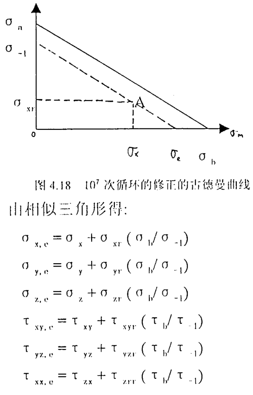 求出各應(yīng)力分量的當(dāng)量穩(wěn)態(tài)應(yīng)力后,即可用歪形能理論求出當(dāng)量穩(wěn)態(tài)應(yīng)力σe,在直角坐標(biāo)中,當(dāng)量應(yīng)力表達(dá)式為: