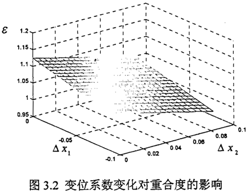 由式3.10、3.11可以看出,當(dāng)總變位系數(shù)xΣ=x2-x1產(chǎn)生變化時(shí),必然引起起嚙合齒輪齒頂圓直徑的變化。按X1、X2變化最小原則,有三種可能性,即X1不變,X2變化0~0.18;或X1變化0~0.18,X2不變;或X1變小,X2變大,變化范圍0~0.09。假定齒輪嚙合角不變,按本文實(shí)驗(yàn)樣機(jī)參數(shù),當(dāng)齒輪變位系數(shù)發(fā)生變化時(shí),其變化量對(duì)重合度的影響狀況見(jiàn)圖3.2所示。從圖3.2所示可以看出,隨外齒輪變位變小時(shí),齒輪嚙合重合度減小,隨內(nèi)齒輪變位變小時(shí),齒輪嚙合重合度增大,從圖中的變化趨勢(shì)為看,外齒輪變位系數(shù)的變化對(duì)重合度的影響程度與內(nèi)齒輪變位系數(shù)的變化對(duì)重合度的影響程度大約是相同的,只是趨向是反向的。