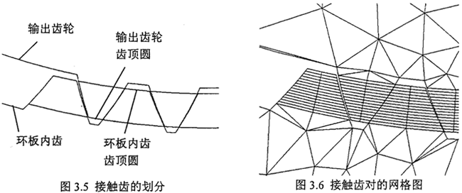 環(huán)板內(nèi)齒輪與輸出軸齒輪之間的傳動(dòng)是直齒輪傳動(dòng),為保證進(jìn)行接觸計(jì)算時(shí),有較多的有較接觸區(qū)域,齒輪輪齒部分的有限元網(wǎng)格采用映射網(wǎng)格劃分法(Mapped Meshing)對(duì)齒輪進(jìn)行有限元網(wǎng)格劃分。同時(shí),為保證兩對(duì)嚙合齒輪所劃分的網(wǎng)格接觸對(duì)相應(yīng)的面能對(duì)應(yīng)齊,因此齒輪嚙合的接觸面相應(yīng)應(yīng)當(dāng)齊整。用輸出軸齒輪的齒頂面所在的輪廓曲面對(duì)環(huán)板內(nèi)齒進(jìn)行劃分(partition 命令),同理用環(huán)板內(nèi)齒的齒頂面所在的輪廓曲面對(duì)輸出軸齒輪進(jìn)行劃分,這樣得到對(duì)應(yīng)齊整的齒輪嚙合的接觸面,如圖3.5所示。根據(jù)圖3.5所示,采用映射網(wǎng)格劃分法( Mapped Meshing)進(jìn)行網(wǎng)格劃分的輪齒部分即是圖中輸出齒輪齒頂圓與環(huán)板內(nèi)齒齒頂圓之間所劃分的部分,而其余部分采用自由網(wǎng)格劃分法(Free Meshing)進(jìn)行劃分,劃分網(wǎng)格后的部分網(wǎng)格圖見(jiàn)圖3.6所示?紤]實(shí)際接觸齒對(duì)數(shù)不會(huì)太多,所以每塊環(huán)板上只給出6個(gè)輪齒進(jìn)行接觸計(jì)算。環(huán)板嚙合的實(shí)際過(guò)程是環(huán)板齒輪帶動(dòng)輸出齒輪運(yùn)動(dòng),計(jì)算時(shí)為方便,假設(shè)環(huán)板固定不動(dòng),設(shè)定輸出軸繞軸線轉(zhuǎn)動(dòng),將減速器的輸出功率換算為輸出扭矩,加在輸出軸的輸出端。