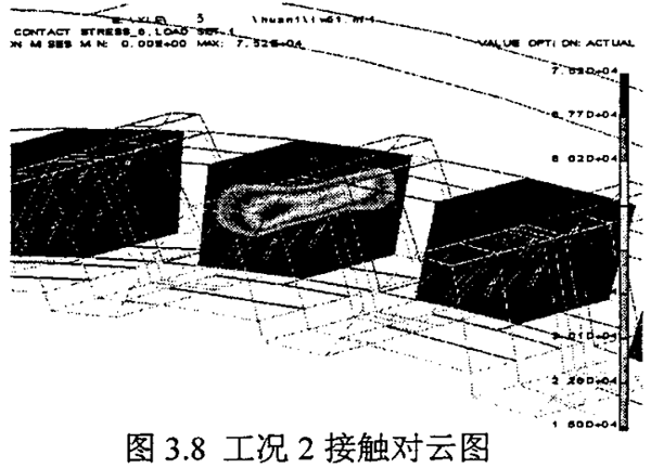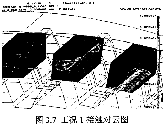 工況六至工況十這四和情況,是指兩環(huán)板之間不對(duì)稱,即偏心軸的兩個(gè)偏心拐的尺寸誤差不一致,這里考慮的是特殊狀況,從表3.10-3.13看出,當(dāng)兩環(huán)板不對(duì)稱時(shí),將產(chǎn)生嚴(yán)重的載荷不均現(xiàn)象,載荷偏向中心距小的環(huán)板內(nèi)齒上,甚至只有一個(gè)環(huán)板承受載荷。由此說(shuō)明,對(duì)于雙環(huán)減速器偏心軸有加工,應(yīng)特別注意兩曲捌的制造誤差,應(yīng)盡量使安裝好的兩環(huán)板具有較好的對(duì)稱性。圖3.7~圖3.12為六種工況下環(huán)板內(nèi)齒的接觸齒對(duì)的應(yīng)力云圖。