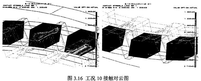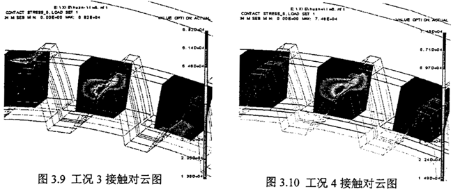 由表3.2~3.13可以看出,無(wú)論有無(wú)制造、安裝誤差的影響,隨著負(fù)荷的增加,齒輪實(shí)際嚙合接觸對(duì)數(shù)增加,但從計(jì)算結(jié)果分析證明,負(fù)荷對(duì)接觸對(duì)的影響小于誤差對(duì)接觸對(duì)的影響。對(duì)比表中的接觸對(duì)數(shù)和接觸應(yīng)力,數(shù)據(jù)表明當(dāng)齒厚發(fā)生變化時(shí),實(shí)際接觸齒對(duì)數(shù)變化比較大,同時(shí)最大接觸應(yīng)力也有明顯變化。從變化的趨勢(shì)上看出與前面的理論推導(dǎo)變化趨勢(shì)相同,這里只是更加明顯。