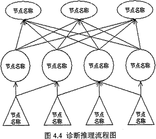 專家知識輸入引擎模塊內(nèi)容如圖4.3所示,該模塊的核心是用圖形化的方式建立診斷推理流程圖,該流程圖是由分布三個層次上的多個節(jié)點及節(jié)點間的連線所組成,如圖4.4。診斷推理流程圖中,底層為“數(shù)據(jù)”層,這里的數(shù)據(jù),可以是測量參數(shù)、傳感器的輸出、工作狀態(tài)、檢修記錄等多種廣泛意義上的參數(shù),中間層為“故障現(xiàn)象”層,這里的癥狀現(xiàn)象可以是能直接觀察到的現(xiàn)象(如工作條件、參數(shù)范圍、參數(shù)變化等),也可以是間接的現(xiàn)象,即多種廣泛意義上的現(xiàn)象。最上層為“故障原因”層。用連線相連彼此相關(guān)的“數(shù)據(jù)”與“故障現(xiàn)象”或“故障現(xiàn)象”與“故障原因”。這樣構(gòu)成診斷推理流程圖。