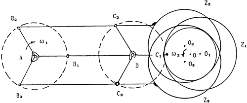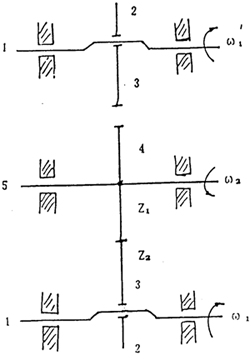 三環(huán)減速器實(shí)質(zhì)上就是一種雙曲柄輸入式、內(nèi)齒輪作圓周平動(dòng)而外齒輪用于輸出的少齒差行星齒輪傳動(dòng)機(jī)構(gòu)。原理如圖2-1所示。雙曲柄機(jī)構(gòu)1-1以轉(zhuǎn)速ω1輸入運(yùn)動(dòng),通過連桿2及與連桿相固連的內(nèi)齒輪了將運(yùn)動(dòng)傳給外齒輪4,并通過外齒輪4將運(yùn)動(dòng)傳遞給5ω2輸出運(yùn)動(dòng)和動(dòng)力,其傳動(dòng)比為: