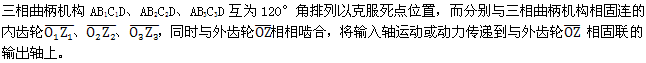 眾所周知,雙曲柄機(jī)構(gòu)的最大缺點(diǎn)就是存在死點(diǎn)位置,即當(dāng)曲柄,與連桿共線時(shí),機(jī)構(gòu)處理運(yùn)動(dòng)不確定位置,其傳動(dòng)角為零,機(jī)械無法運(yùn)動(dòng)。為了克服死點(diǎn)位置,目前已出現(xiàn)了三種解決方法:其一是在同一行星輪上布置多套雙曲柄機(jī)構(gòu)的方法:其二是采用雙曲柄動(dòng)力輸入式方法;基三是采用多相并列式雙曲柄機(jī)構(gòu)來克服死點(diǎn)的方法。三環(huán)減速器就是用三相并列雙曲柄機(jī)構(gòu)來克服死點(diǎn)位置,如圖2-2所示。