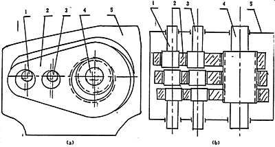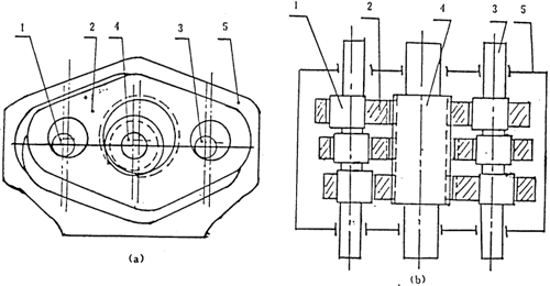 101型三環(huán)減速器基本構(gòu)造如圖2-4(a)(b)所示。其輸出軸4位于輸入軸1和支承軸3之間,受力情況要優(yōu)于110型三環(huán)減速器。