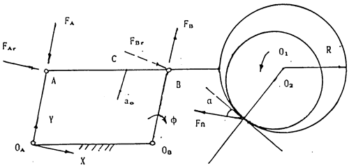 因Fn(Kπ)≠0,則當(dāng)環(huán)板機(jī)構(gòu)過死點(diǎn)位置時(shí),該雙軸柄機(jī)構(gòu)將在嚙合力Fn與輸入軸驅(qū)動(dòng)力FAr的作用下產(chǎn)生反轉(zhuǎn)力矩,有可能在機(jī)構(gòu)的該運(yùn)動(dòng)狀態(tài)的不確定位置ф=Kπ處由正向雙曲柄機(jī)構(gòu)變成反向雙曲柄機(jī)構(gòu),而在此時(shí),另兩套雙曲柄機(jī)構(gòu)將通過轉(zhuǎn)臂軸與偏心套的鍵聯(lián)接處產(chǎn)生推動(dòng)該環(huán)板過死點(diǎn)位置的作用力,克服其反轉(zhuǎn),從而產(chǎn)生沖擊力FBr,否則FB、FA將趨向于無窮大,其物理意義為機(jī)構(gòu)不可能通過死點(diǎn)。顯然,在ф=Kπ的死點(diǎn)位置的微小領(lǐng)域內(nèi),轉(zhuǎn)臂軸的二力桿假設(shè)不在再成產(chǎn)。沖擊力FBr的峰值由該時(shí)刻的動(dòng)力學(xué)方程(2-10)可導(dǎo)出為: