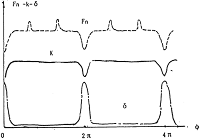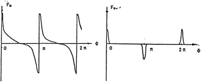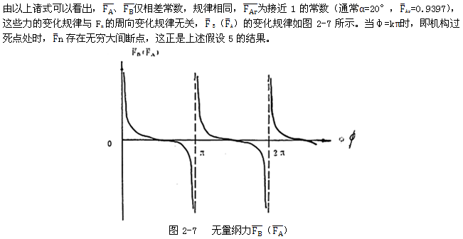 理論上,該力僅在ф=Kπ點(diǎn)產(chǎn)生,而FA、FB將在此點(diǎn)處趨于無窮大。考慮實(shí)際結(jié)構(gòu)的彈性變形等因素,F(xiàn)Br應(yīng)在ф=Kπ的一轉(zhuǎn)角領(lǐng)域內(nèi)ф=Kπ±△ф產(chǎn)生,而FB、FA在該鄰域內(nèi)由正(或負(fù))向峰值過零轉(zhuǎn)變?yōu)樨?fù)(正)向峰值,如圖2-10所示。這是因?yàn)镕B、FA在死點(diǎn)位置附近迅速增大產(chǎn)生的彈性變形也會(huì)使環(huán)板產(chǎn)生微小反轉(zhuǎn)角度,而導(dǎo)致FBr的產(chǎn)生,顯然該微小角度領(lǐng)域的大小以及FB、FA所能達(dá)到的峰值決于環(huán)板的剛度。剛度越大,該領(lǐng)域越小,F(xiàn)B、FA峰值越大,F(xiàn)Br的大小與嚙合力及無量綱參數(shù)(γ+β)成正比。一般情況下,高速重載的三環(huán)減速器、環(huán)板機(jī)構(gòu)的剛度嚙合力等均較大,因此死點(diǎn)處受到的沖擊越大,且沖擊脈沖寬度。ǚ幢扔诮撬俣龋,激振頻率更寬,更易激起廣泛的共振。