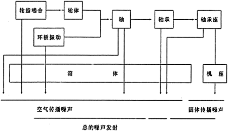 從圖中可知,固體傳播噪聲是由傳遞中的振動(dòng)激勵(lì)引起的,環(huán)板沖擊及輪齒嚙合振動(dòng)通過軸、軸承、軸承座傳向箱體和機(jī)座;引起振動(dòng)而輻射的噪聲通過箱壁向外輻射,此外,由軸的振動(dòng)引起的噪聲的一部分直接向箱體外輻射。