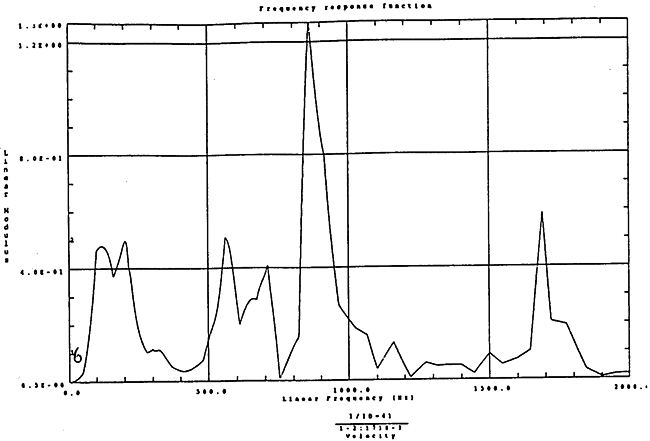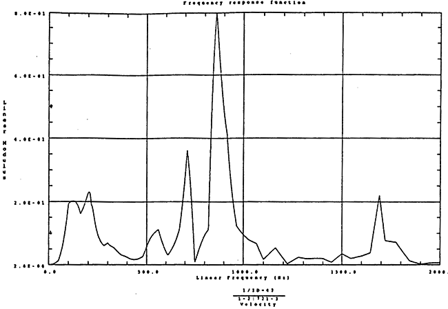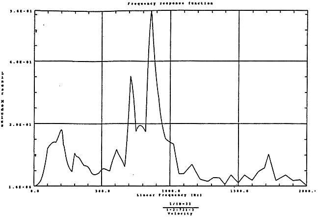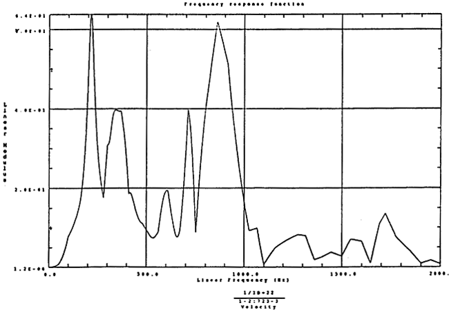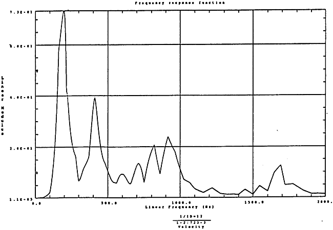 在如圖4-13的1000rm-3350kgm工況下的載荷譜的激勵作用下,SHQ40振動系統(tǒng)測點2、5、8Z向振動速度的幅值譜函數(shù)如圖5-13、圖5-14和圖5-15所錄,圖5-16、圖5-17和圖5-18為其相應的時域波形。振動速度的預估值與試驗的實測值(如表6-12)對比見表5-1所示的工況三。