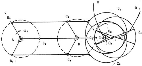 如圖7-1示,三環(huán)減速器三套平面四桿機(jī)構(gòu)AB1C1D-01、AB2C2D2-02、AB3C3O3及外齒輪見圖中所示。在圖示位置時,平面四桿機(jī)構(gòu)AB1C1D處理死點(diǎn)位置,運(yùn)動處于不確定運(yùn)動狀態(tài),由于嚙合力的作用將產(chǎn)和瞬間的沖擊力。為了能除去或減少該沖擊力的作用,我們在一定的角度θ內(nèi)對AB1C1D上的內(nèi)齒輪進(jìn)行修形,使在死點(diǎn)位置時,平面四桿機(jī)構(gòu)AB1C1D不受嚙合力或少受嚙合力作用,這樣,通過其余兩套平面四桿機(jī)構(gòu)就能較易將其速成過死點(diǎn)位置,從而達(dá)到減不止或消除過死點(diǎn)的沖擊。同樣,對另兩套平面四桿機(jī)構(gòu)AB2C2D2及AB3C3O3作同樣的修形。這種方法我們已正在試驗(yàn)過程中。