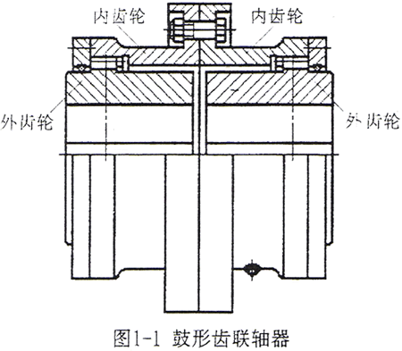 鼓形齒聯(lián)軸器(結構如圖1-1所示)是機械傳動的重要基礎部件,它是在直齒齒輪聯(lián)軸器基礎上為滿足大傾角、變化傾角、大傳遞轉矩、小尺寸、高可靠性等要求發(fā)展起來的。它已在冶金、采礦、化工、起重運輸?shù)葯C械設備中廣泛應用[65-67]。尤其是在冶金設備中更是大量采用。如武鋼引進的一米七軋機系統(tǒng)中裝機量達2500套。國際上一些工業(yè)發(fā)達國家五十年代就有鼓形齒聯(lián)軸器的應用。我國近十幾年來從國外引進的成套和單機設備中大量采用了鼓形齒聯(lián)軸器。國內雖在六十年代開始在軋機主傳動上應用了鼓形齒聯(lián)軸器,但是設計制造技術落后,沒有廣泛推廣應用。近十幾年來,國內一些廠家為了滿足從國外引進設備的鼓形齒聯(lián)軸器的進口設備備件需要,通過消化吸收引進技術,進行批量仿制鼓形齒聯(lián)軸器,同時進行較深入的機理研究[69-79]。但未建立一套自己的完整合理的設計方法,制造技術也較落后。