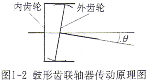 鼓形齒聯(lián)軸器傳動原理如圖1-2所示。鼓形齒聯(lián)軸器的內齒輪為一直齒內齒輪。外齒輪是齒頂面為一球面的鼓形齒輪。根據外齒輪齒面產生方式的不同,外齒輪又分為共軛齒面鼓形齒輪和非共軛齒面鼓形齒輪。由于鼓形齒輪加工工藝的關系,現(xiàn)使用的鼓形齒聯(lián)軸器多為非共軛齒面外齒輪的鼓形齒聯(lián)軸器。共軛齒面的鼓形齒齒面由與內齒輪共軛的加工方式產生;非共軛齒面的鼓形齒齒面相當于在不同端截面逐漸變位的一系列齒輪片相迭而成,變位量與軸向坐標形成的曲線稱為鼓度曲線。鼓度曲線是鼓形齒聯(lián)軸器特有的重要幾何參數(shù),現(xiàn)所用的多為一段圓弧,也有用三段圓弧的,這些圓稱為位移圓。在圓弧鼓度曲線中,有位移圓中心在齒輪軸線上的,有不在軸線上的;有位移圓中心與齒頂球面中心重合的,也有不同中心的。鼓度曲線的設計無統(tǒng)一理論方法,通常是一經驗設計。究竟采用哪種曲線,有不同的考慮方面,總的待定要求是:(1)在軸間傾角處于最大時不出現(xiàn)棱邊接觸現(xiàn)象;(2)輪齒集中載荷越小越好,而齒面曲率與位移圓曲率成正比,因此位移圓半徑rg應盡可能大。鼓度曲線曲率半徑與內齒單側減薄量成正比關系,即它與齒的嚙合間隙有關,減薄量不足時可能造成干涉,減薄過多則削弱齒的強度且側隙太大。