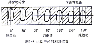鼓形齒聯(lián)軸器的運動狀態(tài)是復雜的空間運動,F(xiàn)有資料均把它簡化為展開的平面運動進行分析,在有軸間傾角的狀態(tài)下,將運動分為齒的擺動運動和翻轉運動。這兩種運動在嚙合半周中經歷純擺動—復合運動—純翻轉—復合運動—純擺動的循環(huán)運動過程,如圖1-3所示。純擺動—純翻轉的相位差為90°。在非純擺動和純翻轉運動過程中,內外齒的相對運動是擺動運動和翻轉運動的復合運動[68]。顯然這種簡化分析方法是很粗略的,無法確切地描述空間嚙合狀態(tài),但是它對于分析齒向位移、棱邊卡死現(xiàn)象及說明某一輪齒所處周向位置是有意義的。