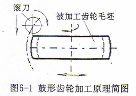 普通滾齒機(jī)具有主切削運(yùn)動(dòng)傳動(dòng)鏈、分齒運(yùn)動(dòng)傳動(dòng)鏈、進(jìn)給運(yùn)動(dòng)傳動(dòng)鏈和差動(dòng)運(yùn)動(dòng)傳動(dòng)鏈,通過調(diào)整,能夠滿足圓柱齒輪和蝸輪的加工要求。本改造的內(nèi)容是要使其能夠滿足特定鼓度曲線的鼓形齒輪的加工要求,即在鼓形齒輪一定的軸向位置有一定的徑向變位,這就需要增加一個(gè)加工運(yùn)動(dòng)的自由度。加工原理如圖6-1所示。