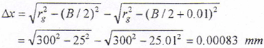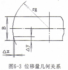 位移傳感器根據(jù)運(yùn)動(dòng)的型式不同分為直線位移傳感器和角度位移傳感器,直線位移傳感器常見的有光柵位移傳感器、感應(yīng)同步傳感器等,它們可以直接安裝在所測直線運(yùn)動(dòng)部件上,無傳動(dòng)誤差影響,精度高。但是由于結(jié)構(gòu)的原因,它們需要非常精確的安裝基準(zhǔn)和合適的安裝空間,且通常情況下安裝定位較困難。由于光柵的密封性較差,光柵材料較脆弱,所以它們的抗污染性能和抗振性能也較差,而且所需防護(hù)裝置也較復(fù)雜,成本較高。角度位移傳感器最常用的有光電編碼器,它具有精度高,體積小,安裝方便、密封性好、抗污染和抗振性能好等優(yōu)點(diǎn)。本設(shè)計(jì)需測刀架的位移,在刀架上,切削冷卻潤滑油、切屑及粉塵的飛濺較嚴(yán)重,且不易設(shè)置防護(hù)裝置。如果采用光電編碼器需通過檢測絲桿的角位移間接檢測刀架的直線位移,但絲桿及傳動(dòng)機(jī)構(gòu)具有的傳動(dòng)精度和位移檢測精度是足夠的。另外,加工鼓形齒輪時(shí),形成鼓度曲線的實(shí)際切削位置通常在曲線較陡的范圍,例如加工圓弧鼓度曲線,幾何關(guān)系見圖6-3,設(shè)位移圓半徑rg=300mm,齒寬B=50mm,當(dāng)Δy=0.01mm,則