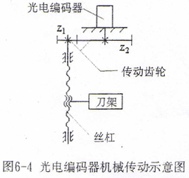 由于機(jī)床的刀架進(jìn)給絲桿的位置及結(jié)構(gòu)關(guān)系,通常不能將光電編碼器直接聯(lián)接在刀架進(jìn)給絲桿的端頭,需將絲桿的旋轉(zhuǎn)運(yùn)動(dòng)通過一對齒輪傳至光電編碼器。機(jī)械傳動(dòng)示意圖如圖6-4所示。
