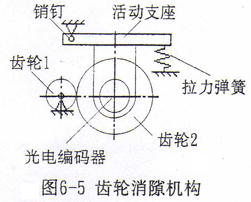 普通滾齒機(jī)具有刀架進(jìn)給絲桿的消隙機(jī)構(gòu),因此絲桿正反轉(zhuǎn)無間隙。齒輪的安裝有側(cè)隙存在,為了消除側(cè)隙對位移檢測影響,采用彈簧消隙機(jī)構(gòu),機(jī)構(gòu)簡圖如圖6-5所示。光電編碼器安裝在活動(dòng)座上,其軸上裝有齒輪2,齒輪1與刀架進(jìn)給絲桿固連,活動(dòng)支座在彈簧作用下繞銷釘轉(zhuǎn)動(dòng),壓迫齒輪2與齒輪1使其無側(cè)隙。由于光電編碼器的驅(qū)動(dòng)力矩非常小,因此所需的彈簧的拉力也很小,不會(huì)對光電編碼的正常工作造成不良影響。