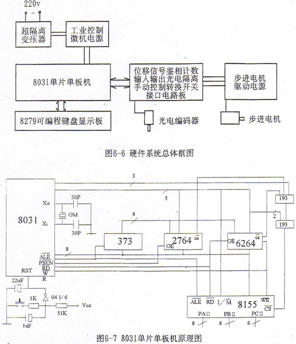 數(shù)控硬件由8031、外擴(kuò)一片程序存貯器芯片2764、外擴(kuò)一片數(shù)據(jù)存貯器6264和外擴(kuò)一片通用可編程并行輸入/輸出接口芯片8155、總線、片選擇碼電路、采用8279芯片的通用鍵盤顯示電路和位移鑒相輸入及驅(qū)動(dòng)輸出的接口電路組成。數(shù)控系統(tǒng)的現(xiàn)場抗干擾性能直接關(guān)系到整個(gè)系統(tǒng)的成敗。在硬件方面,為了防止強(qiáng)電電網(wǎng)的電壓尖峰和毛刺對系統(tǒng)的干擾,采用抗干擾能力強(qiáng)的工業(yè)用微機(jī)電源、超隔離變壓器、片選法譯碼電路、光電隔離電路。