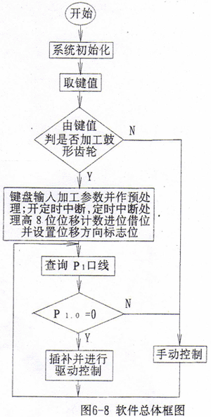 本系統(tǒng)的軟件采用模塊化設(shè)計(jì),主要包括系統(tǒng)初始化、數(shù)據(jù)輸入和顯示、插補(bǔ)運(yùn)算和驅(qū)動(dòng)控制、定時(shí)中斷處理位移信號、自動(dòng)與手動(dòng)控制等功能模塊。軟件總體框圖如圖6-8所示。