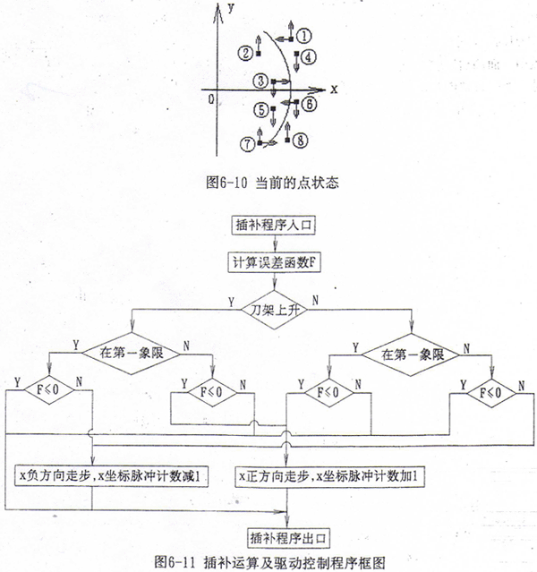非圓弧曲線插補(bǔ)運(yùn)算時(shí),首先根據(jù)當(dāng)前的Y坐標(biāo)值及插補(bǔ)曲線f(x,y)=0,求解出x坐標(biāo)理論值xt,設(shè)當(dāng)前的實(shí)際x坐標(biāo)為xr,令誤差函數(shù)F=xr-xt。對圓弧曲線,根據(jù)當(dāng)前的x、y坐標(biāo),計(jì)算x2+y2值,令誤差函數(shù)F=x2+y2-R2。根據(jù)當(dāng)前點(diǎn)在不同象限、當(dāng)前刀架的運(yùn)動(dòng)方向及誤差函數(shù)的正負(fù),共有8種情況出現(xiàn)(如圖6-10所示),應(yīng)根據(jù)它們的狀態(tài)進(jìn)行不同的處理。①、⑥兩種情況應(yīng)使當(dāng)前點(diǎn)向x坐標(biāo)負(fù)方向走步;③、⑦兩種情況應(yīng)使當(dāng)前點(diǎn)向x坐標(biāo)正方向走步;②、④、⑤、⑧四種情況無需在x坐標(biāo)方向走步。由于在切齒過程中刀架的進(jìn)給速度較低,最高一般不超過30毫米/分鐘,兩次y坐標(biāo)計(jì)數(shù)脈沖間隔時(shí)間可達(dá)幾十毫秒,而插補(bǔ)運(yùn)算的時(shí)間不超過1毫秒,因此插補(bǔ)速度足夠。在刀架快速運(yùn)動(dòng)時(shí),插補(bǔ)有滯后,但此時(shí)不切削,這種滯后不影響加工。在插補(bǔ)過程中,顯示器輪流顯示當(dāng)前的x、y坐標(biāo)值,以利于操作者監(jiān)視加工情況,因此還需進(jìn)行顯示BCD碼的轉(zhuǎn)換和輪換的控制。插補(bǔ)運(yùn)算及驅(qū)動(dòng)控制程序框圖見圖6-11。
