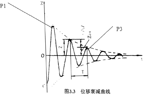 試樣在被輕輕錘擊所產(chǎn)生自由阻尼振動,其加速度信號通過載荷放大器輸入頻譜分析儀,經(jīng)兩次積分后得出位移衰減曲線,如下圖3.3所示?傻贸龃簻笞枘嵯禂(shù)。