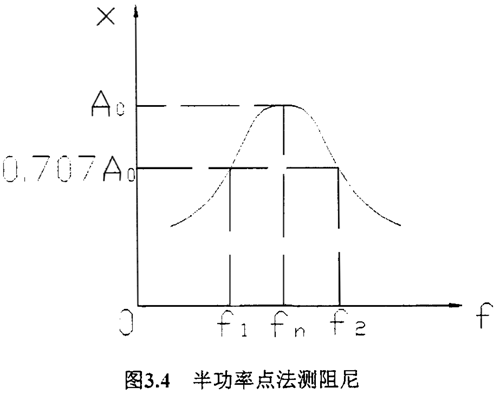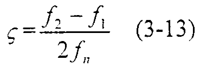 由振動理論知,一個振動系統(tǒng)的能量是與其振幅的平方成正比。系統(tǒng)強(qiáng)迫振動的能量在共振點(diǎn)前后能量為共振時能量的1/2處的兩個頻率f1、f2稱為半功率點(diǎn)頻率,則此半功率點(diǎn)頻率這差值與系統(tǒng)的阻尼比之間有如下關(guān)系