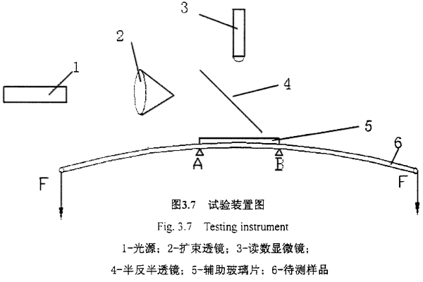 如下圖3.7所示,在A、B兩支點(diǎn)上,放一截面為矩形,長度為L的試件,兩端加外力F(集中力),使試件產(chǎn)生無損彎曲。