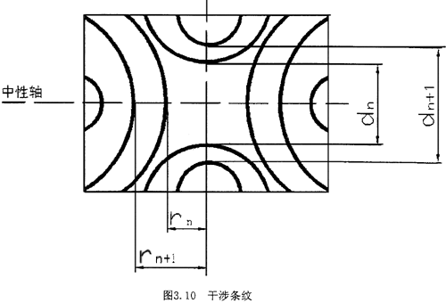 在干涉式測量系統(tǒng)中,輔助玻璃片與變形的試件表面間形成一層薄膜。當(dāng)光源經(jīng)擴(kuò)束透鏡和半反透射鏡垂直照射時,入射光將在些薄膜上下表面反射,產(chǎn)生具有一定光程左的兩束相干光,產(chǎn)生一系列明暗交替的雙曲線,在計(jì)數(shù)顯微鏡中將觀察到雙曲線等厚干涉條紋,如圖3.10所示。