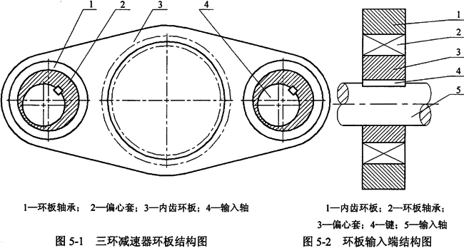 筆者設(shè)計(jì)的新型三環(huán)減速器的均載裝置就是利用了滑動(dòng)軸承的動(dòng)壓原理,在三環(huán)減速器輸入軸偏心套與環(huán)板軸承內(nèi)圈之間插入一個(gè)能夠自由轉(zhuǎn)動(dòng)的浮動(dòng)套筒(浮環(huán)),在偏心軸旋轉(zhuǎn)時(shí),在偏心套與浮環(huán)之間、浮環(huán)與軸承內(nèi)圈均形成動(dòng)壓油膜,這種結(jié)構(gòu)減小了偏心套與軸承內(nèi)圈、偏心套與輸入軸的剛性接觸,提高了偏心套、環(huán)板軸承的壽命。當(dāng)一塊環(huán)板的轉(zhuǎn)臂軸承所受的載荷增加時(shí),相應(yīng)的偏位角隨之減少,這降低了接觸面的溫升,更重要的是浮環(huán)內(nèi)、外所形成的油膜的最小油膜位置的點(diǎn)將產(chǎn)生移動(dòng),使內(nèi)嚙合放松,嚙合力減小,則該環(huán)板上的載荷自然就會(huì)減少,同時(shí),另外一環(huán)板,則使內(nèi)嚙合變緊,嚙合力增大,環(huán)板上的載荷自然就會(huì)增大,從而達(dá)到各環(huán)板載荷均衡的目的。