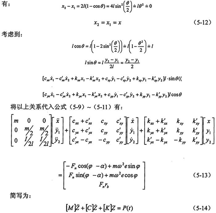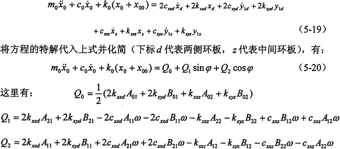 由第三章的分析知,油膜力是復(fù)雜的非周期性函數(shù),考慮到軸徑的振幅很小,對(duì)油膜力作線性化處理(所得函數(shù)仍含有耦合項(xiàng)),由于油膜剛度較轉(zhuǎn)臂軸承和偏心軸的剛度小的多,這里僅考慮油膜的影響,應(yīng)用牛頓第二定律可列出該環(huán)板的運(yùn)動(dòng)微分方程(先不考慮環(huán)板的標(biāo)號(hào))。