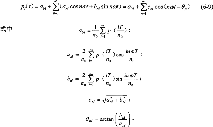 方程右端的激勵精圖治振力是復(fù)雜周期函數(shù),依據(jù)傅里葉級數(shù)展開原量,可將非簡諧的周期性激振力展成多個頻率成整倍數(shù)關(guān)系的簡諧激振力函數(shù)之和。由前面分析知,連桿力分力、慣性力和曲柄軸扭矩均為曲柄轉(zhuǎn)角的函數(shù),由于曲柄軸轉(zhuǎn)速恒定,故,激振力為時間的函數(shù),設(shè)為Pl(t),(l=1,2,3,4)其周期為T,考慮到激振力函數(shù)復(fù)雜且連桿力中的懸點(diǎn)載荷W難以用數(shù)學(xué)表達(dá)式描述,積分難以實(shí)現(xiàn),采用求和的方法求系數(shù)更為有效,以n0作為一個周期的等分區(qū)間數(shù)(一般取n0=36),時間區(qū)間為△t=T/n0,則它的傅里葉級數(shù)為: