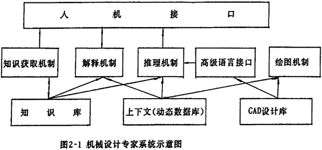 專家系統(tǒng)通常有知識庫、上下文(context)——或稱動態(tài)(當(dāng)前)教據(jù)庫、推理機、知識獲取機制、解釋機制、人機接口,對于機械設(shè)計系統(tǒng)來說,還有相應(yīng)的繪圖系統(tǒng),以及實現(xiàn)調(diào)用產(chǎn)品性能分析、優(yōu)化設(shè)什軟件包的與其它高級語言的接口。專家系統(tǒng)結(jié)構(gòu)見圖2-l,其各自的功能分別為: