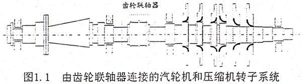 以往在對(duì)軸承一轉(zhuǎn)子系統(tǒng)進(jìn)行動(dòng)力學(xué)分析的過(guò)程中,對(duì)于構(gòu)成系統(tǒng)的一些典型部件,如轉(zhuǎn)子、支承軸承、密封以及基礎(chǔ)都作過(guò)較深入的研究,但對(duì)于聯(lián)軸器耦合效應(yīng)的討論卻不多。直觀地講,多跨轉(zhuǎn)子正是依賴多個(gè)聯(lián)軸器才得以構(gòu)成大型系統(tǒng)的,因此更確切地講對(duì)于大型的多跨(或分跨)轉(zhuǎn)子系統(tǒng)可以稱(chēng)為軸承—轉(zhuǎn)子—聯(lián)軸器系統(tǒng)。以大型的汽輪發(fā)電機(jī)組和壓縮機(jī)組為例,汽輪發(fā)電機(jī)組在低壓轉(zhuǎn)子、發(fā)電機(jī)轉(zhuǎn)子以及勵(lì)磁機(jī)轉(zhuǎn)子間均采用了剛性或半撓性聯(lián)軸器結(jié)構(gòu);對(duì)于壓縮機(jī)組,在壓縮機(jī)轉(zhuǎn)子和驅(qū)動(dòng)設(shè)備如驅(qū)動(dòng)汽輪機(jī)轉(zhuǎn)子或電機(jī)轉(zhuǎn)子之間也要采用不同形式的聯(lián)軸器。圖1.1所示是一透平壓縮機(jī)組的簡(jiǎn)圖,為一典型的軸承—轉(zhuǎn)子—齒輪聯(lián)軸器系統(tǒng),整體系統(tǒng)由一個(gè)CL型的齒輪聯(lián)軸器將汽輪機(jī)轉(zhuǎn)了和壓縮機(jī)主軸連接組成。