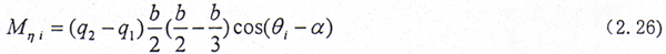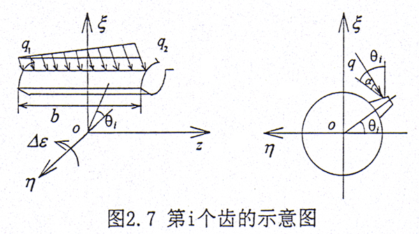 在外載荷較大時(shí),則齒輪聯(lián)軸器內(nèi)外齒面之間接觸良好。設(shè)齒面上的載荷是線性分布,其集度分別為q1、q2,如圖2.7所示。在繞η方向給一小轉(zhuǎn)角△δ,則在第i個(gè)齒對(duì)產(chǎn)生的扭矩為Mηi。b是穩(wěn)態(tài)時(shí)內(nèi)外齒之間的有效接觸齒寬。
