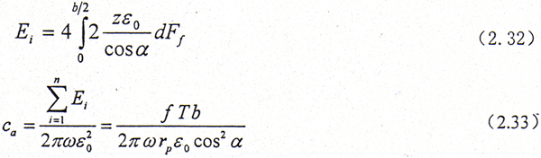 設(shè)內(nèi)、外齒輪軸線間有一相對(duì)橫向振幅δ0,如圖2.10所示,則第i對(duì)齒面相對(duì)滑動(dòng)的位移為δi=δ0/cosα,齒面滑動(dòng)摩擦力為Ff=fT/rpncosα,其中f為齒面間的滑動(dòng)摩擦系數(shù),第i對(duì)齒對(duì)上的摩擦力消耗的能量為Ei=4Ffδi