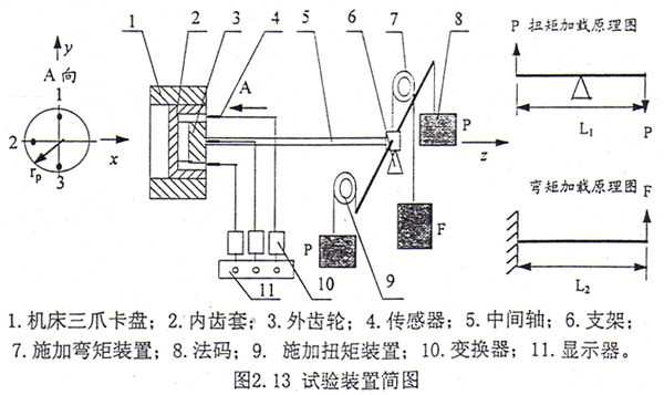 齒輪聯(lián)軸器的內(nèi)齒套固定在一個(gè)三爪卡盤(pán)上,聯(lián)軸器的外齒輪插入內(nèi)齒套與之相嚙合。采用3個(gè)電渦流傳感器,傳感器的布置見(jiàn)圖2.13,試驗(yàn)臺(tái)的實(shí)拍照片見(jiàn)圖2.14。中間軸的一端與外齒輪固接,而另一端則用于施加扭矩和施加繞X方向的彎矩。扭矩和彎矩的大小由法碼的重量和桿或軸的長(zhǎng)度來(lái)確定。作用于聯(lián)軸器上的扭矩